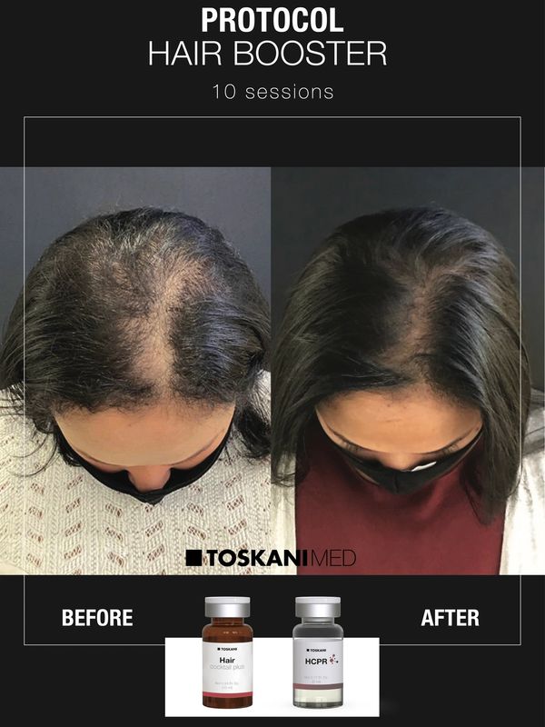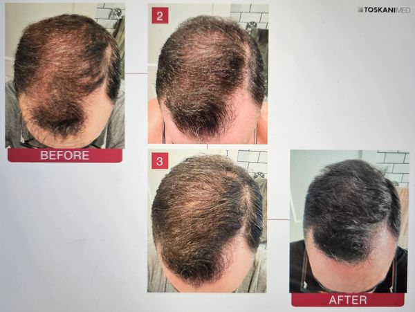 Microneedling with TOSKANI MED Hair Cocktail Plus serum grows hair in 5 to 10 treatment sessions. Treatments scheduled every 2-3 weeks.